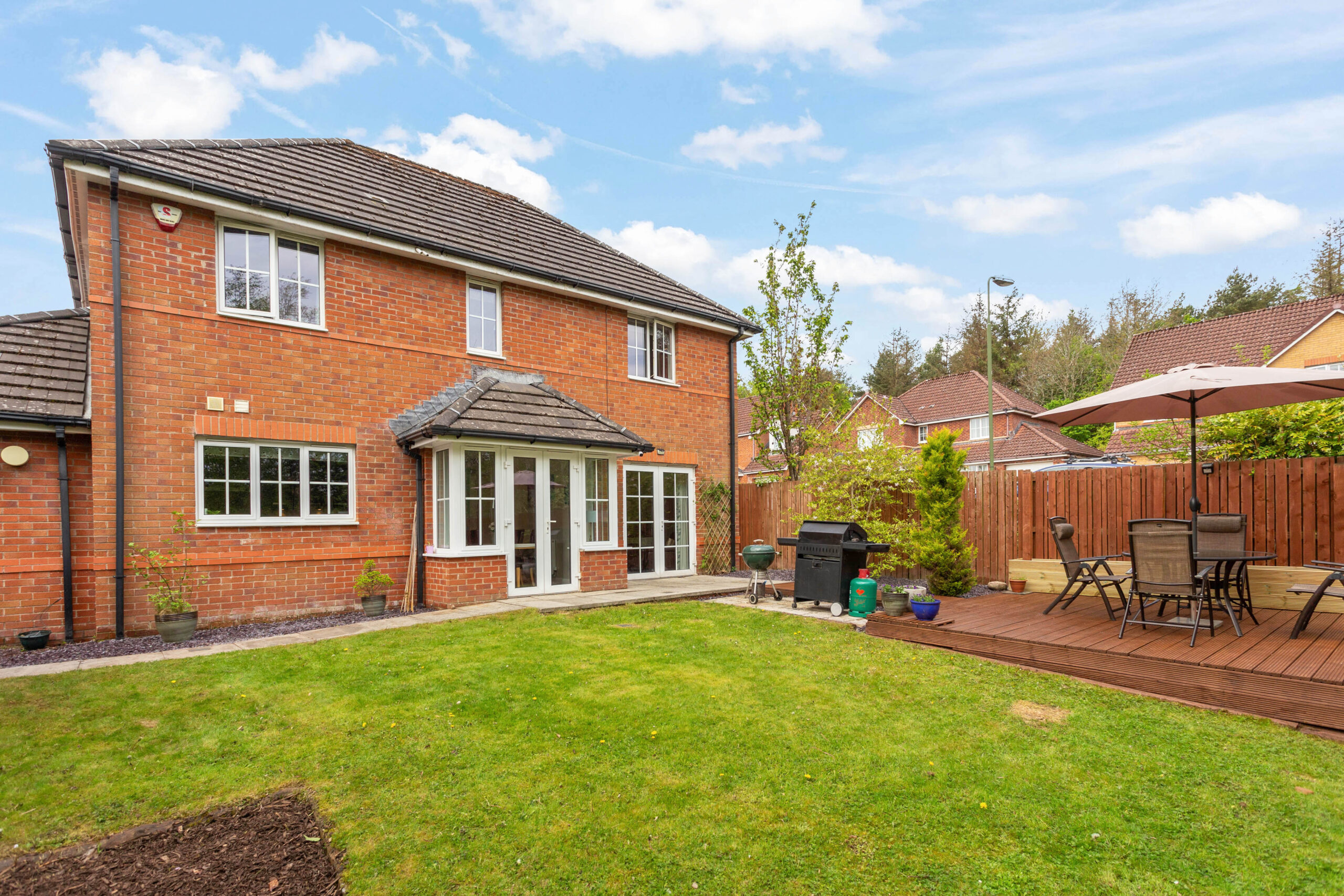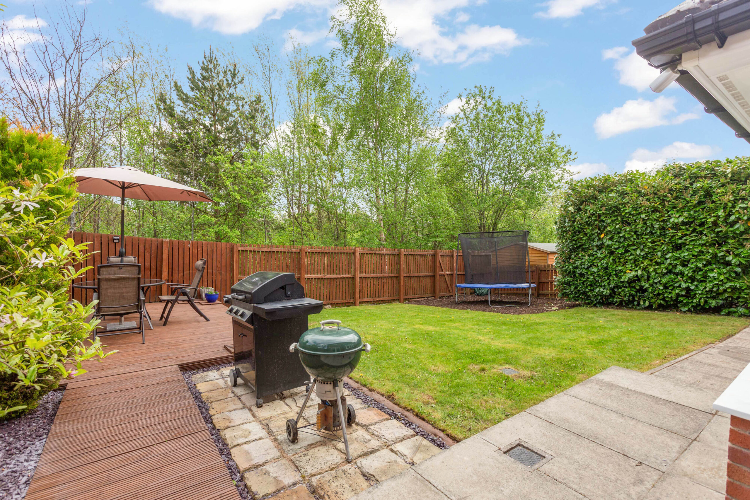 Outside, the rear garden is a landscaped sanctuary against a woodland backdrop, complete with a decked area, paved patio, and a lush lawn, ensuring a perfect setting for leisure and entertainment. The front garden is laid to lawn and the hedge provides a high degree of privacy.